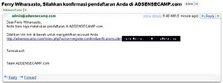 4. Setelah registrasi sukses, AdsenseCamp akan mengirimkan email aktivasi ke alamat email yang Anda daftarkan.